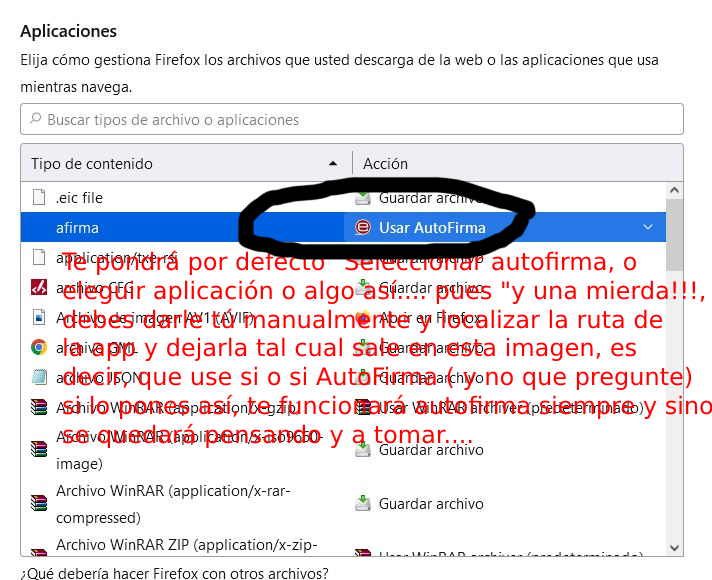 Pues bien, que me pierdo, el tema se soluciona bien fácil, te vas a AJUSTES DE FIREFOX, luego a General y bajas hasta el apartado "Aplicaciones" y ahí pones manualmente que para la extensión AutoFirma, se abra la app en cuestión y no que pregunte... y lo dejas así;